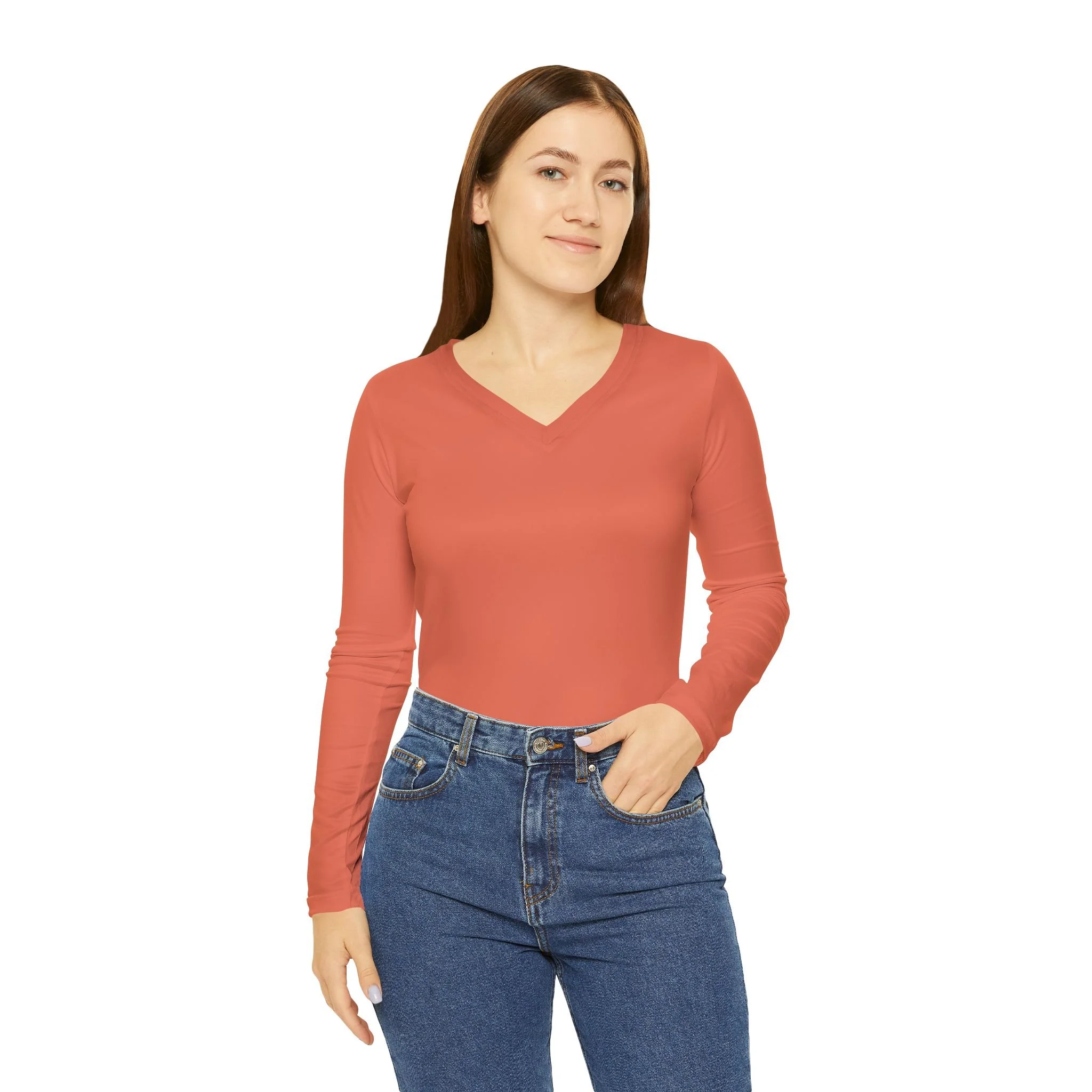 Elevate your daily wardrobe with these women's long sleeve V-neck shirts made from a soft and lightweight polyester-spandex blend. Add your own art to create a versatile and stylish staple for any occasion. Perfect for those looking for comfort and style in their everyday outfits.