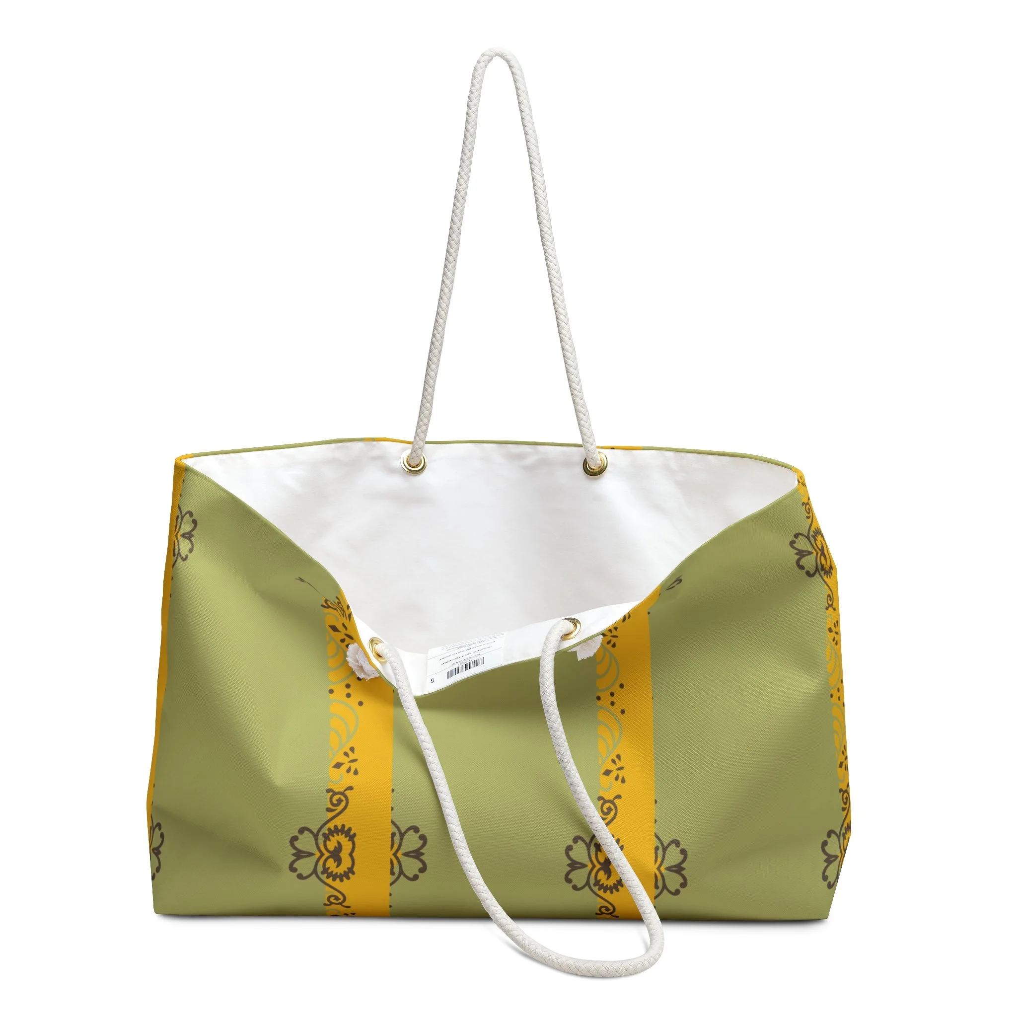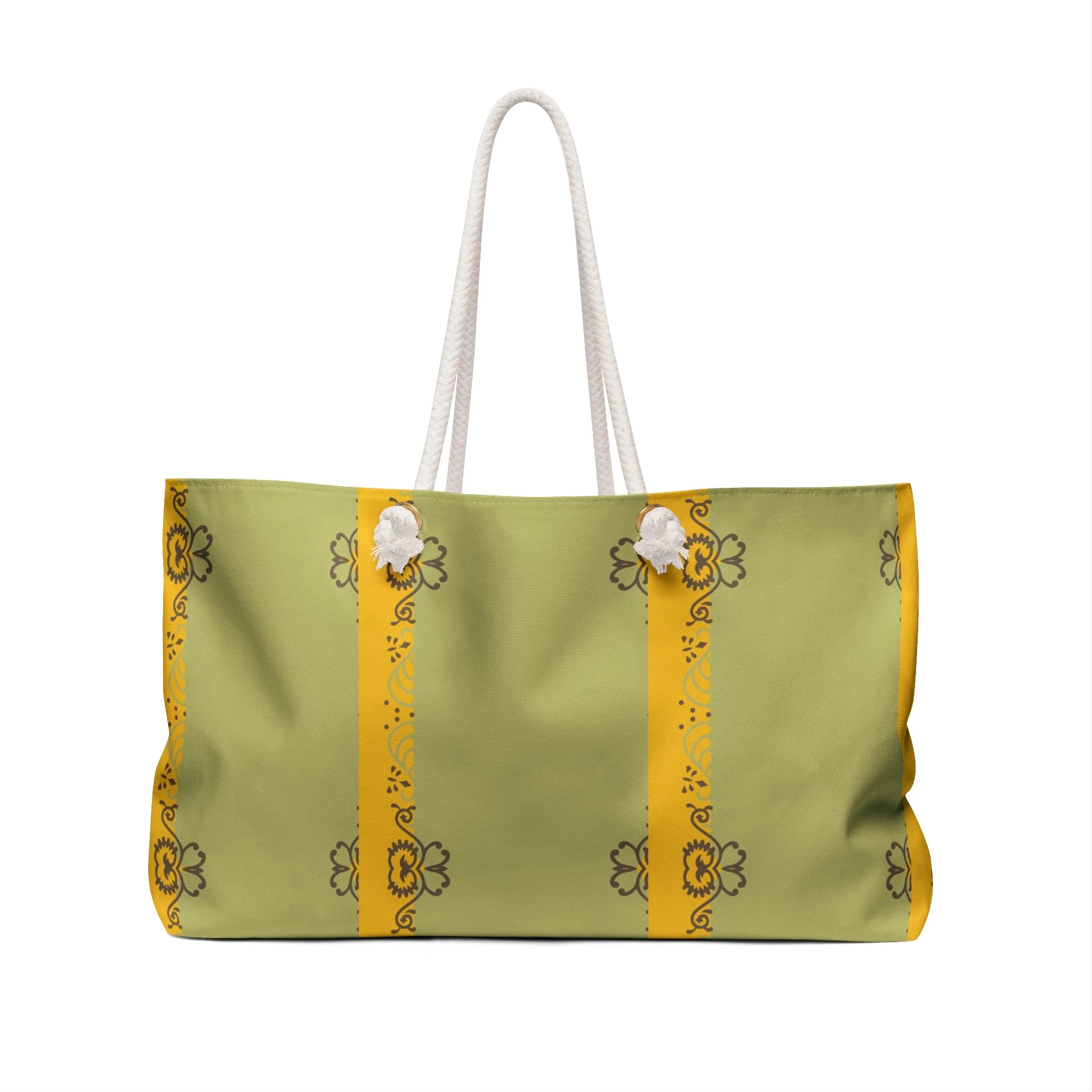 This personalized weekender bag comes in one size – 24" x 13" (60.9 cm x 33 cm) – perfect for those who love to travel light. Its t-bottom construction and black handles give it a sleek, classic look.